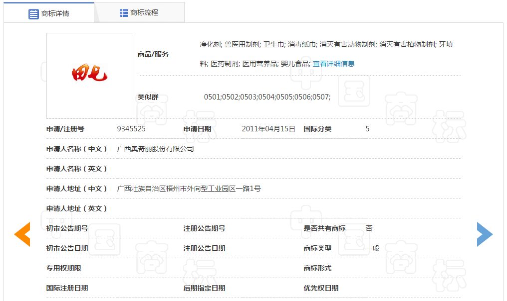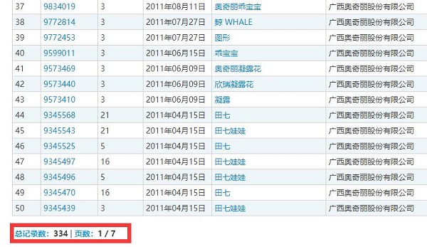根據(jù)商標(biāo)局查詢,奧奇麗公司共申請注冊了334件商標(biāo),包括“田七、奧奇麗、強力”等等。這次拍賣的便是“田七”系列的商標(biāo)。