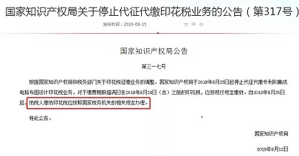 自2019年8月25日起,國知局停止代征代繳印花稅業(yè)務(wù),納稅人繳納印花稅應(yīng)按照國家稅務(wù)機關(guān)的相關(guān)規(guī)定辦理。